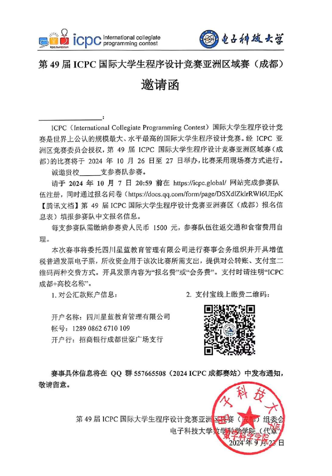 第 49 届 ICPC 亚洲区域赛成都邀请函&报名指南